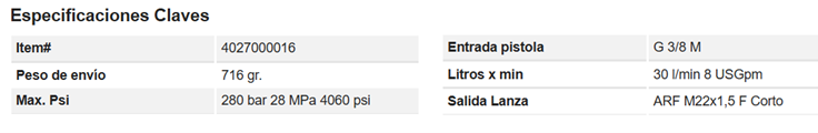 Pistola con media lanza completa AL28, para lavadora a presión industriales agrega un gran rendimiento de limpieza a las lavadoras a presión con una clasificación de hasta 280 bar 28 MPa 4060 psi 30 l/min 8 USGpm